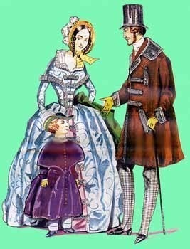 На его супруге открытое утреннее платье с удлиненной талией и плотно обтягивающим фигуру лифом. Узкие рукава до запястья; у запястья рукава отвернуты так, что получаются как бы маленькие отложные манжеты. Длинная, касающаяся носков туфелек юбка отделана от талии до подола "брандербурами" - декорированными застежками из шнурка или сплетенными из тесьмы навесными петлями и пуговицами. Ю6ка присборена в талии и выглядит очень пышной благодаря турнюру и многочисленным нижним юбкам. Шляпка дамы в стиле "passe-etroite" украшена плюмажем. В руке у дамы шаль с бахромой. На мальчике бархатное пальто, из-под которого выглядывают панталончики щиколотку длиной.